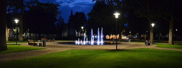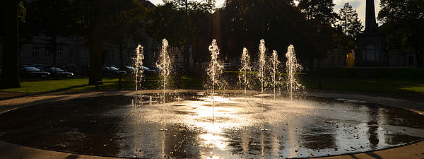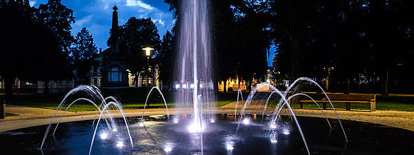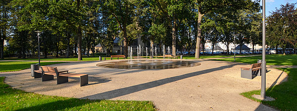 Eine runde Fontänenfeldfläche mit zwei Kreisen und jeweils 12 Düsen mit LED Beleuchtung und einer Mittelfontäne mit ca. 7 m Höhe! Das Fontänenfeld bildet das Herzstück des neugestalteten Kaiser-Wilhelm-Platzes, denn das sternförmige Wegenetz bietet von allen Seiten des Parks Zugang zum Wasserspiel. Kein Zufall, denn genau an dieser Stelle stand früher schon einmal ein Brunnen. Das ganze Konzept der Umgestaltung greift die Geschichte des Parks auf und bietet somit eine gelunge Kombination aus Historie und Modernität. Eine neue geschaffene Oase, die zum Verweilen einlädt, Kindern eine tolle Spielmöglichkeit bietet und für Spaß und Abkühlung an warmen Sommertagen sorgt. Durch die Absenkung der bodennahen Lufttemperatur wird nebenbei auch noch ein Abkühlungseffekt erzielt, was für Verbesserung des Mikroklimas führt und somit den Wohlfühlfaktor für Passanten und Anwohner erhöht. Lesen Sie hier warum die Abkühlung dieser Bereiche wichtig ist wie nie zuvor